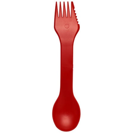 3-in-1 lusikka, haarukka ja veitsi. Haarukassa on sahalaitainen leikkausreuna.