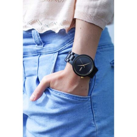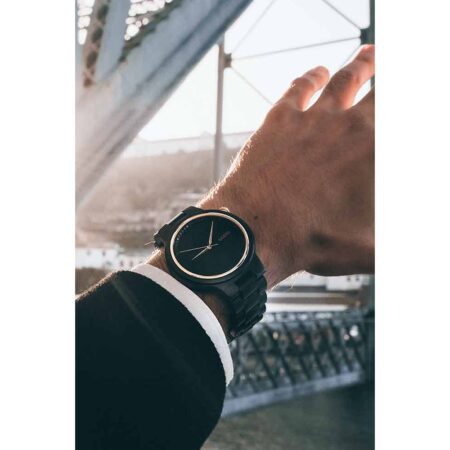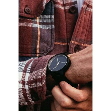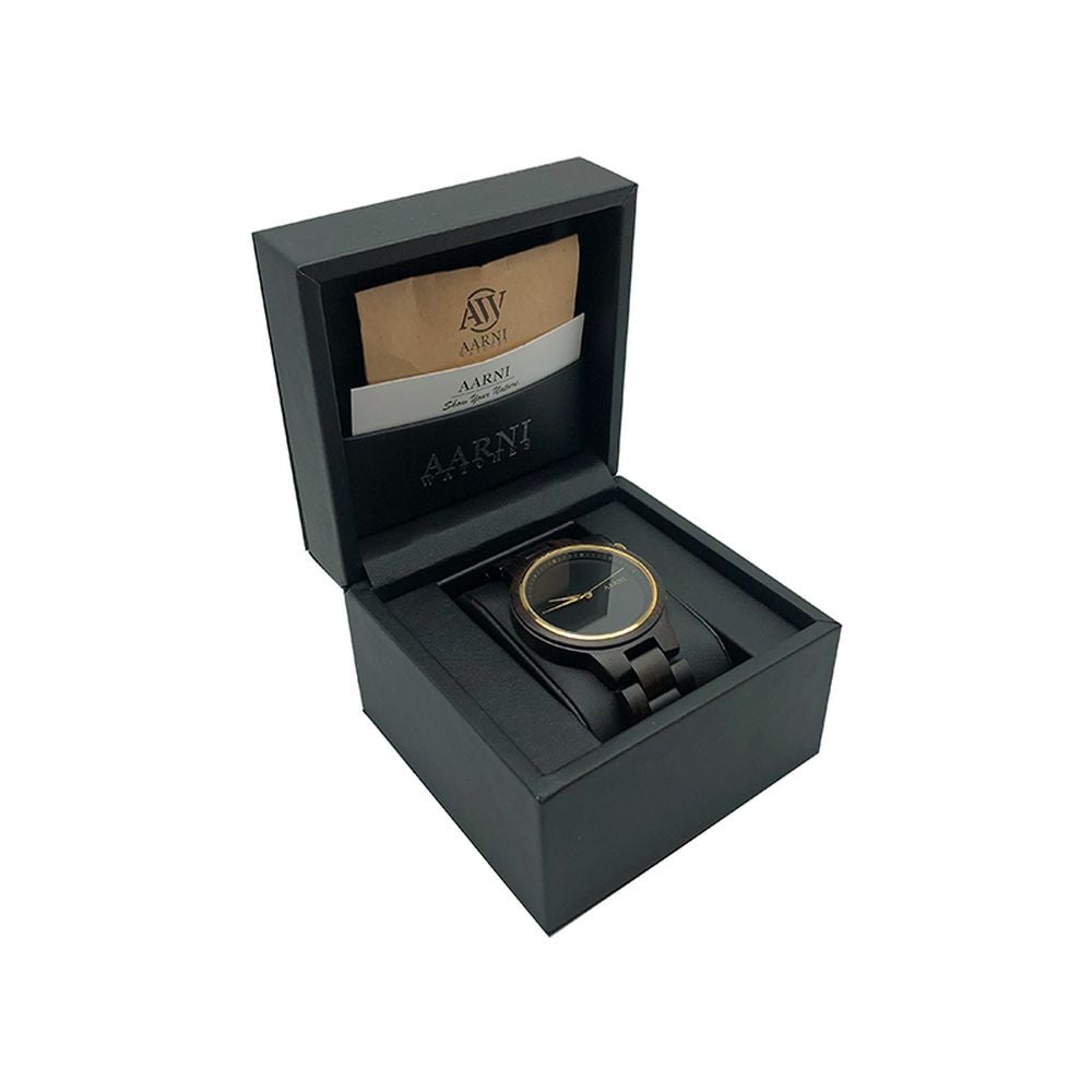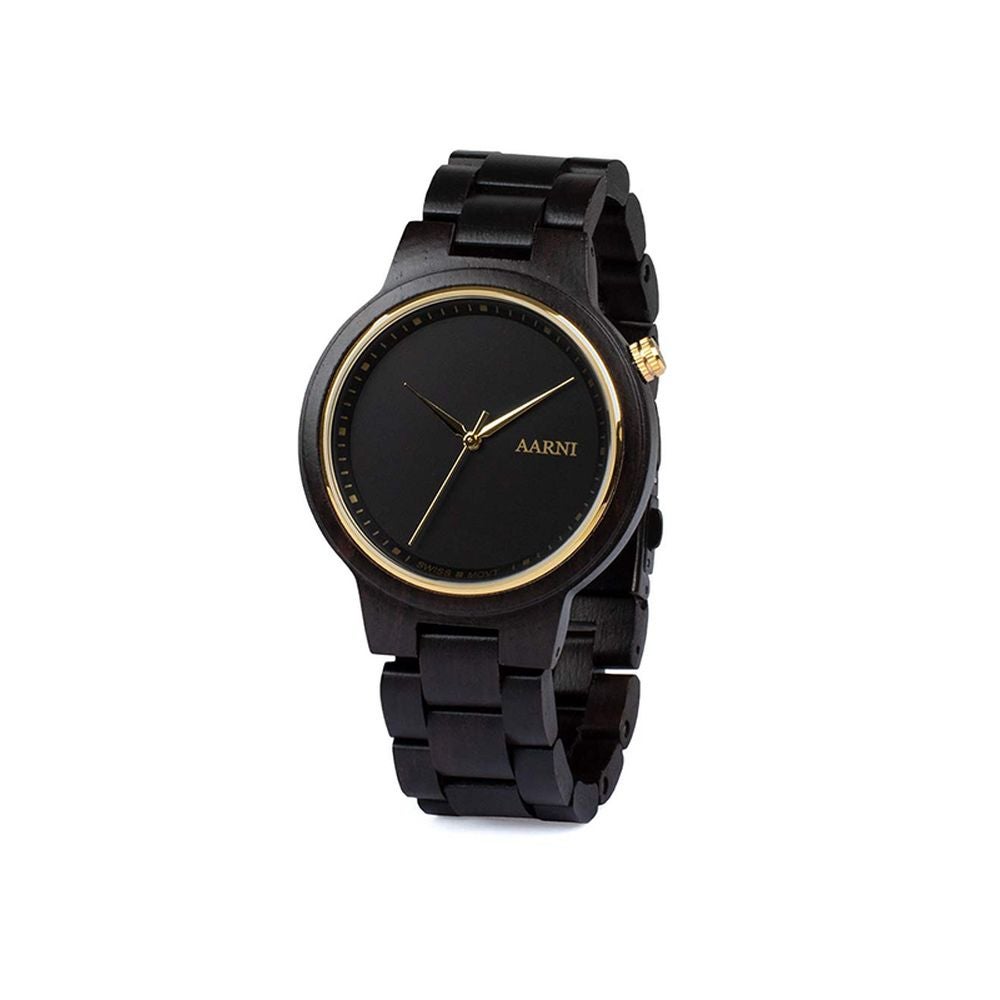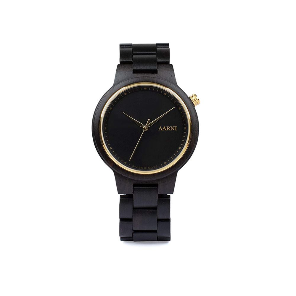 Mystiikkaa ja klassista kauneutta. Eebenpuusta valmistettu Aarni XO yhdistää pyöreän kellotaulun kultaisiin yksityiskohtiin.