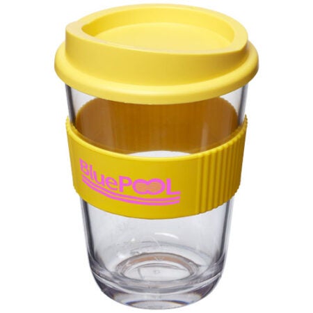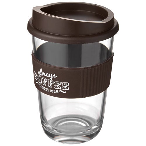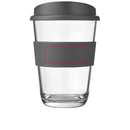 Kestävä termosmuki yksinkertaisella seinällä, painettava roiskumaton kansi ja silikoninen oterengas.