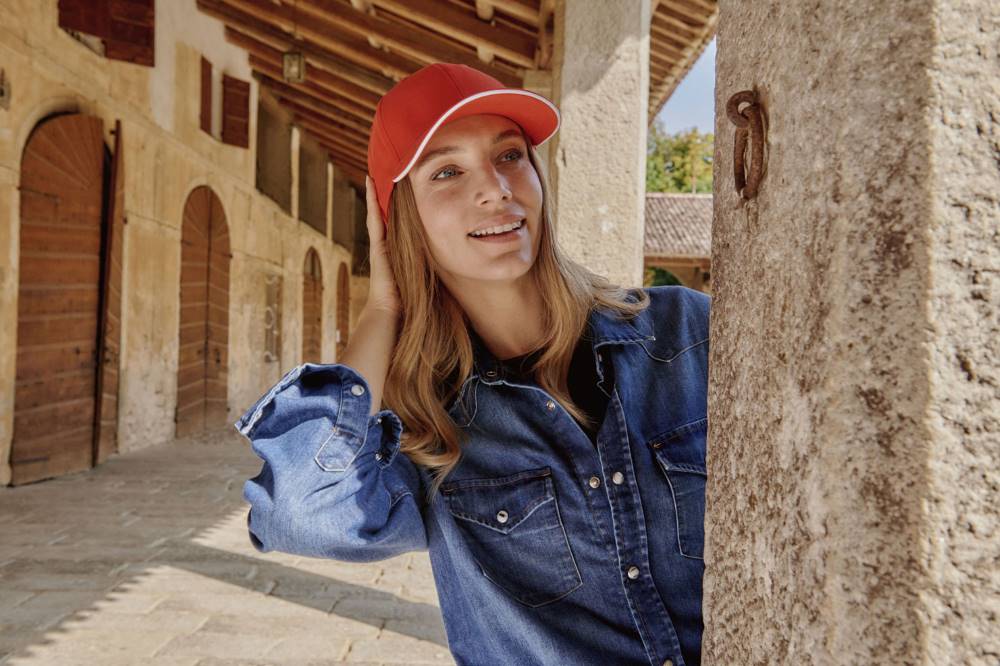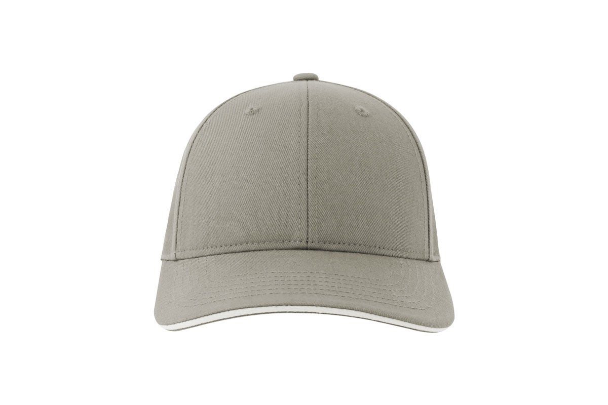Mallissa on kaareva lippa värillisellä sandwichilla. Takana koon säätö metallisella soljella.