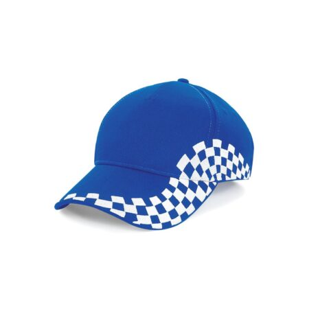 Beechfield Grand Prix Lippis jonka sivussa brodeeratut ruutulippusomisteet.