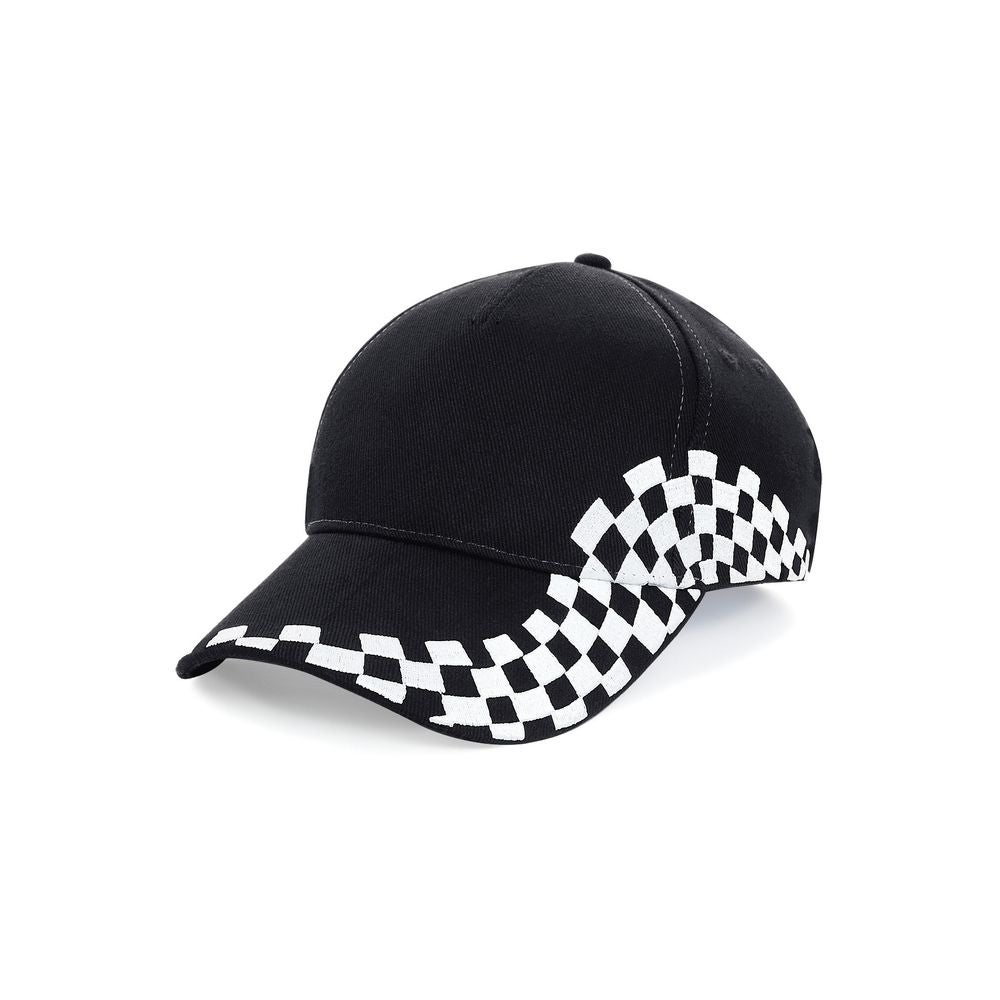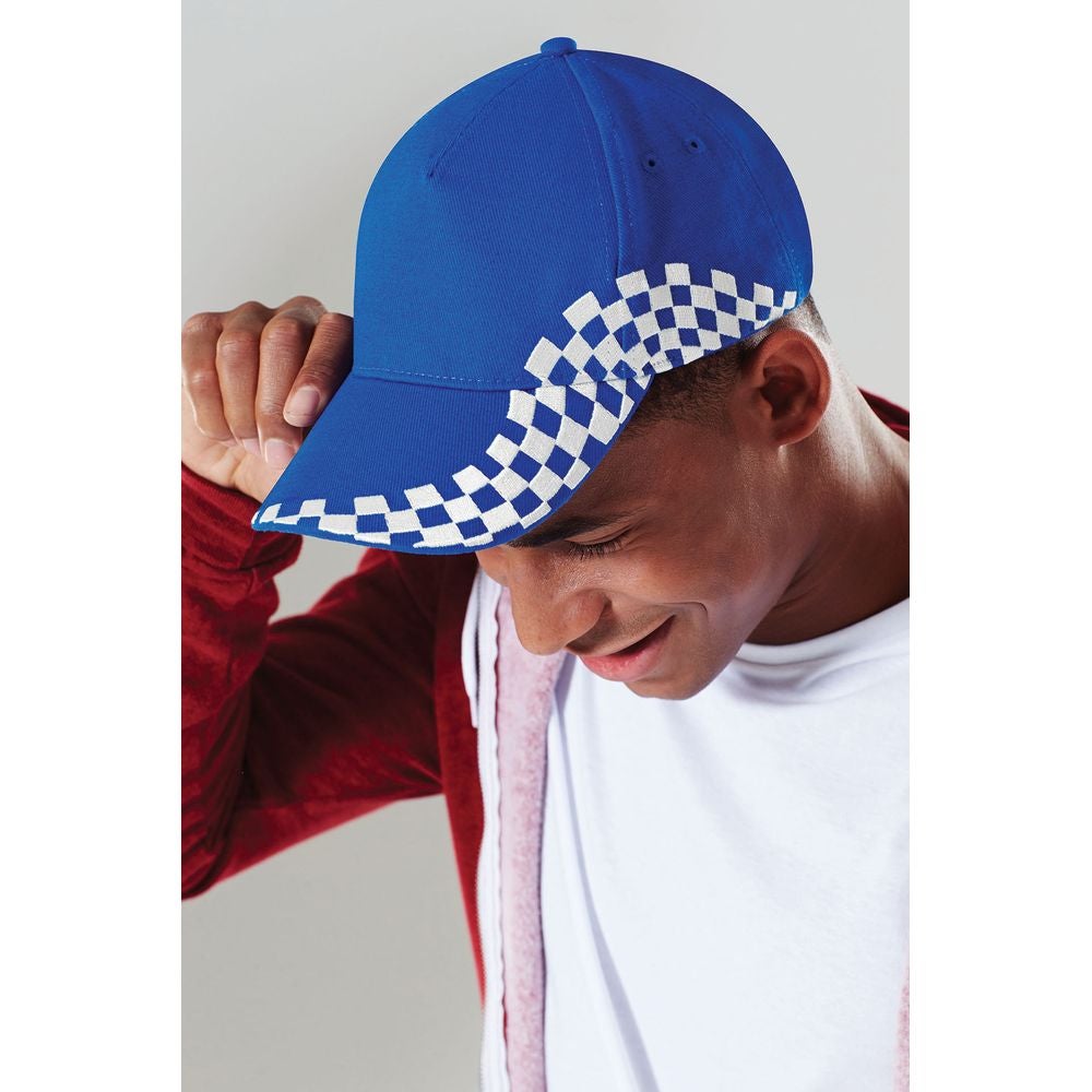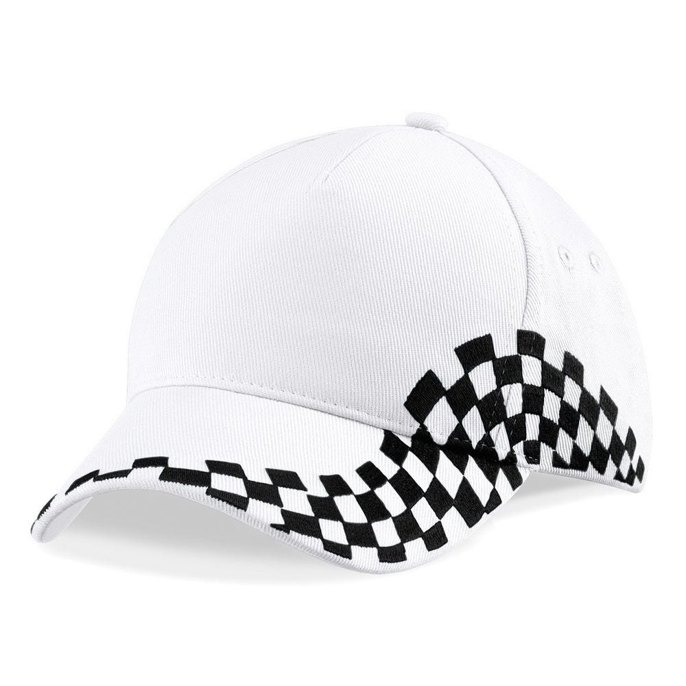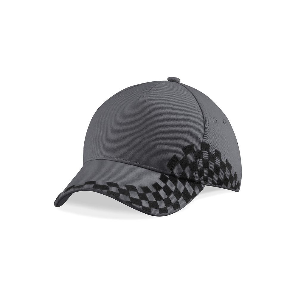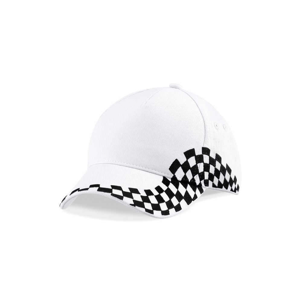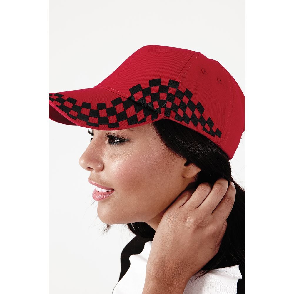 Beechfield Grand Prix Lippis jonka sivussa brodeeratut ruutulippusomisteet.