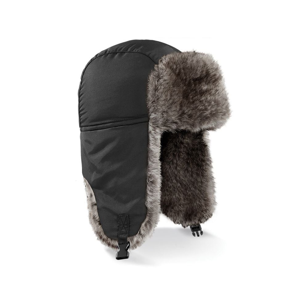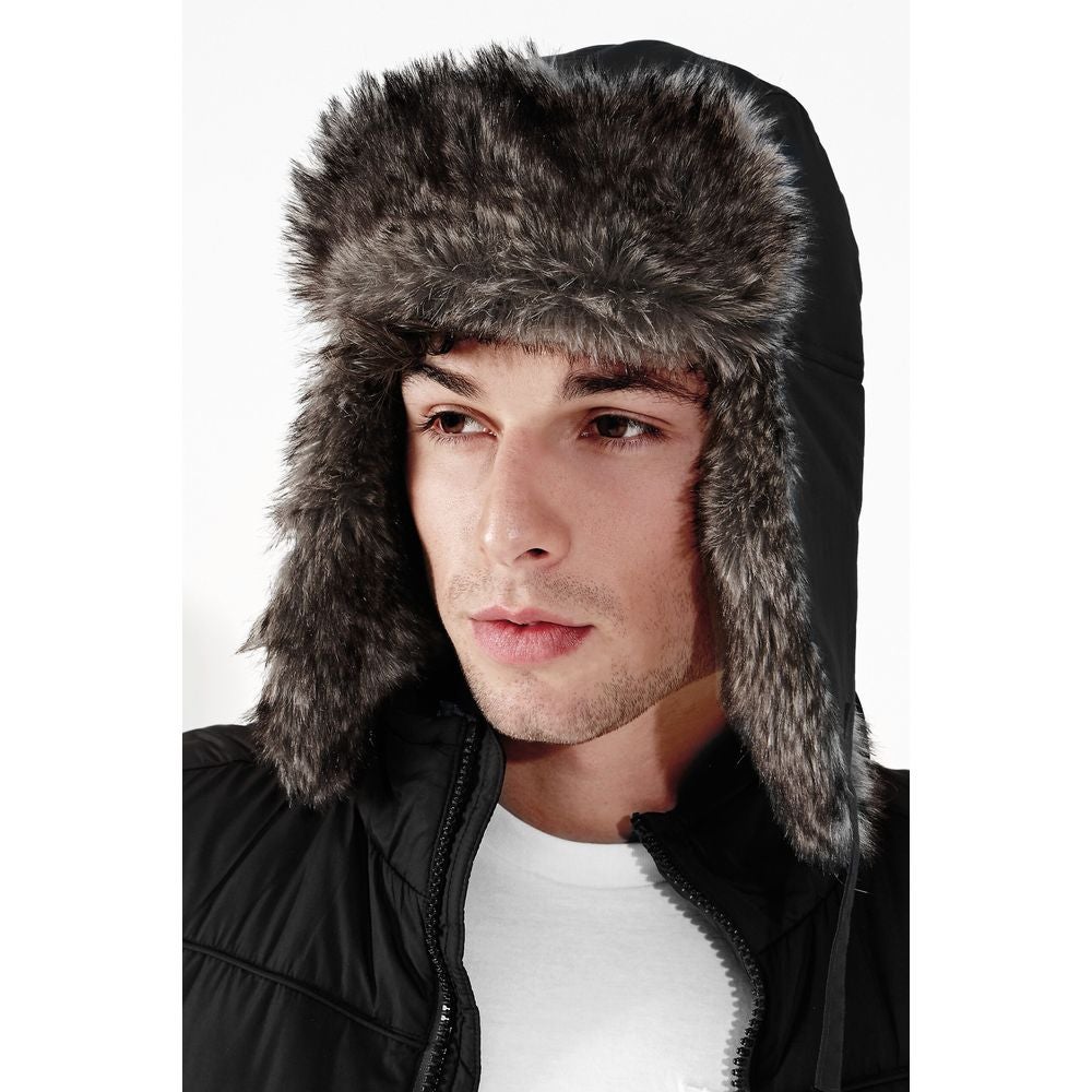 Lämmin ja kestävä Beechfield Sherpa karvahattu. Korvaläpät voidaan kiinnittää päälaelle tai leuan alle yhteen muovisella pikalukolla.