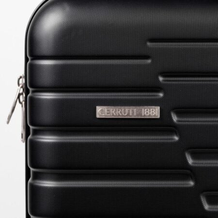 Tukeva vetokahva ja neljä ympäri pyörivää pyörää. Tyylikkään vetolaukun edessä metallilaatta jossa Cerrutin logo.