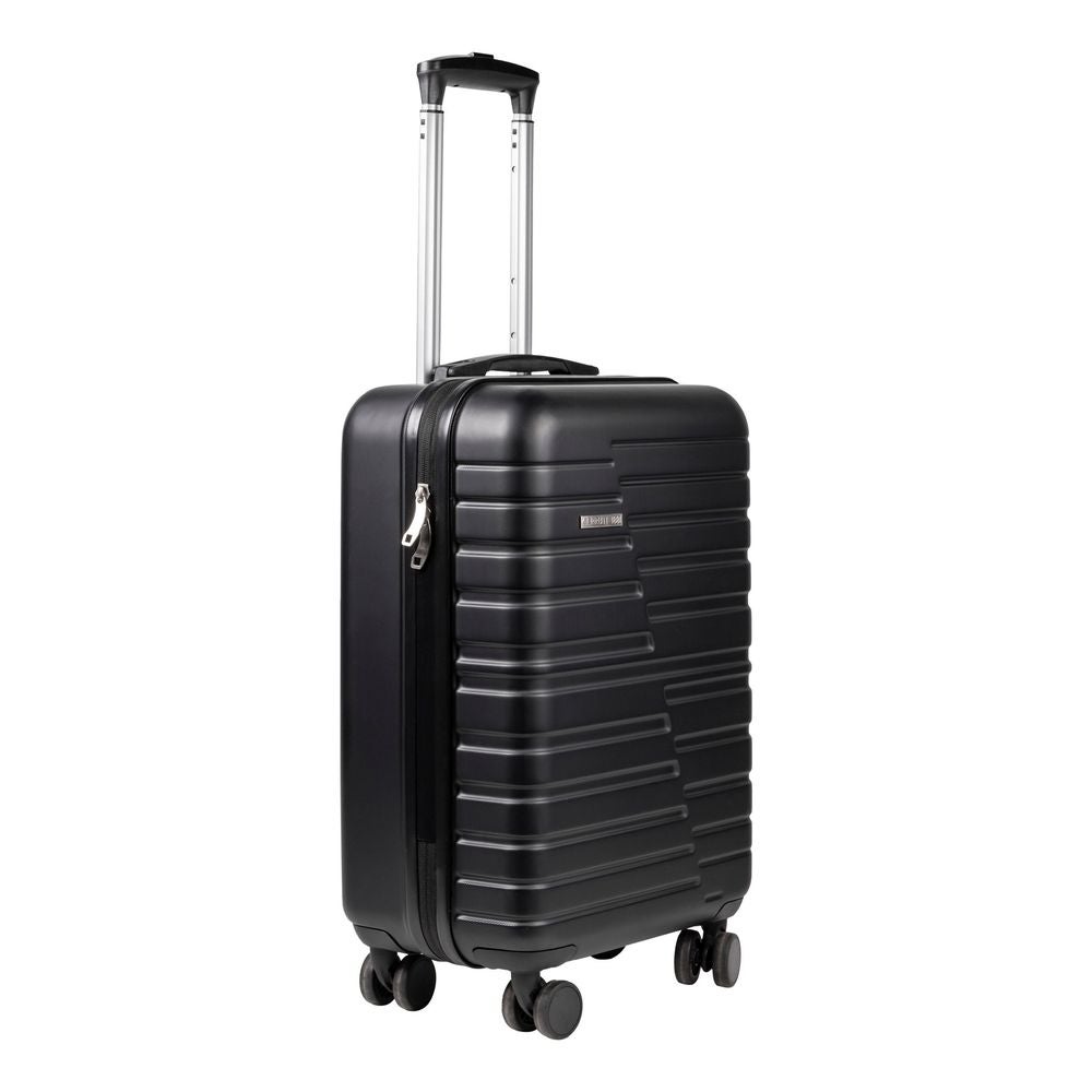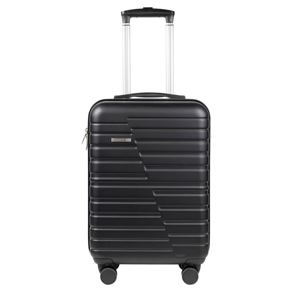 Tukeva vetokahva ja neljä ympäri pyörivää pyörää. Tyylikkään vetolaukun edessä metallilaatta jossa Cerrutin logo.