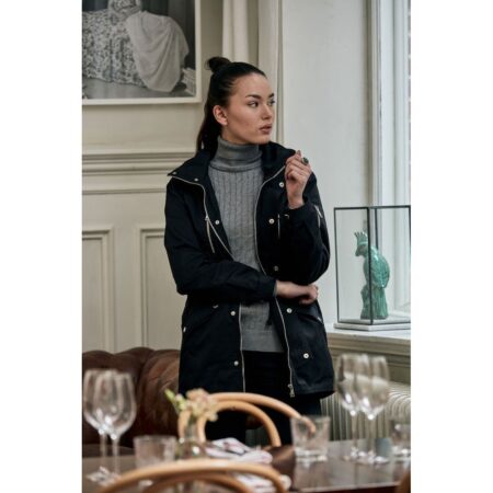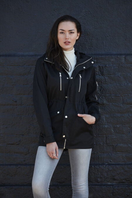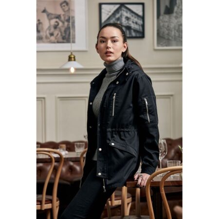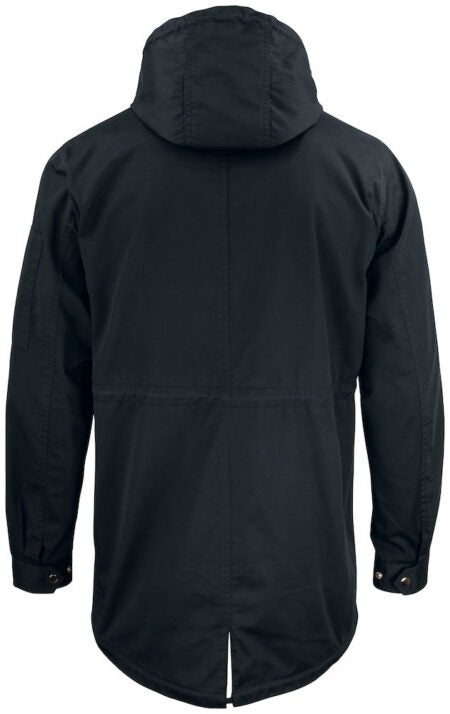 Käärittävä huppu, kaksi etutaskua läpällä ja kaksi rintataskua vetoketjulla.