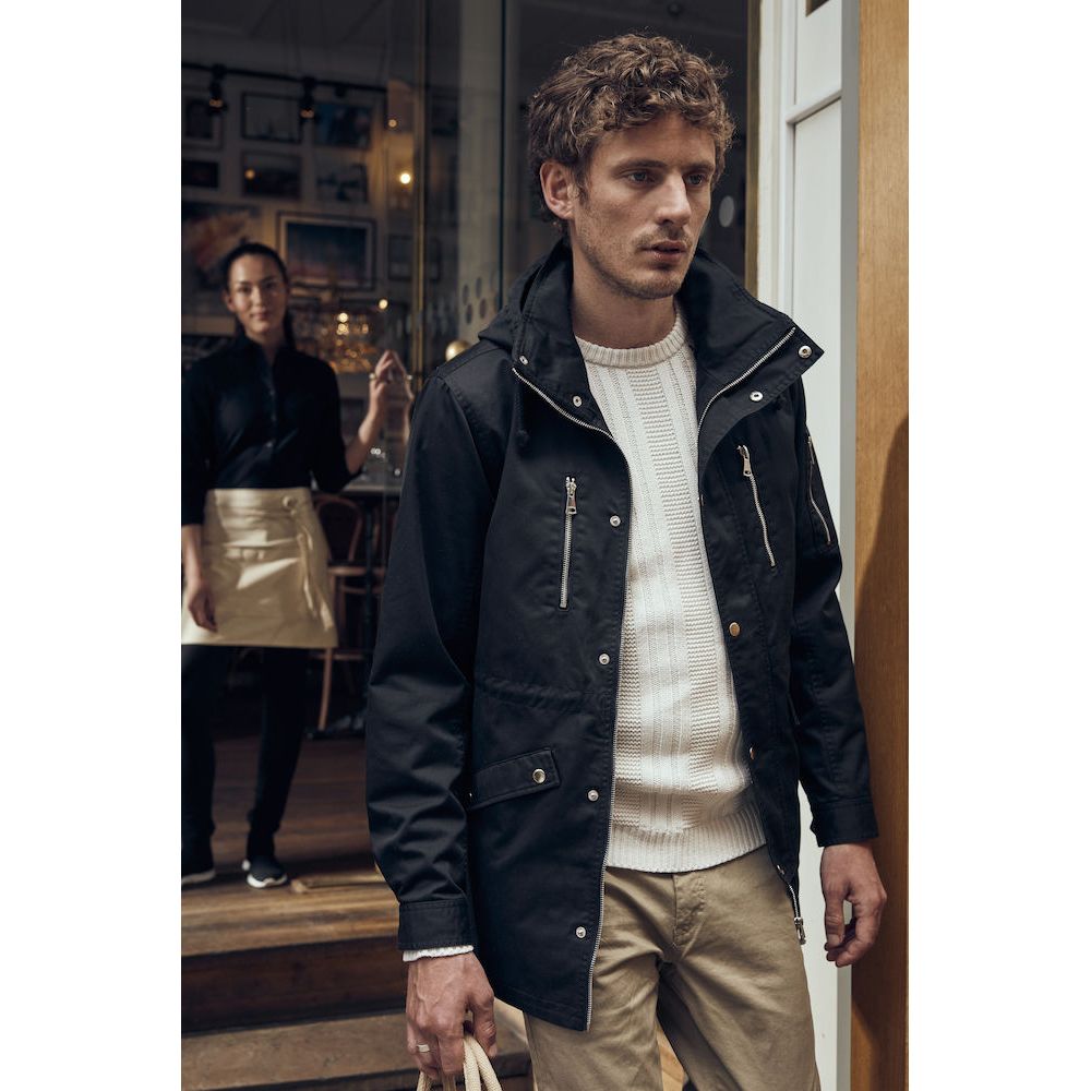 Käärittävä huppu, kaksi etutaskua läpällä ja kaksi rintataskua vetoketjulla.