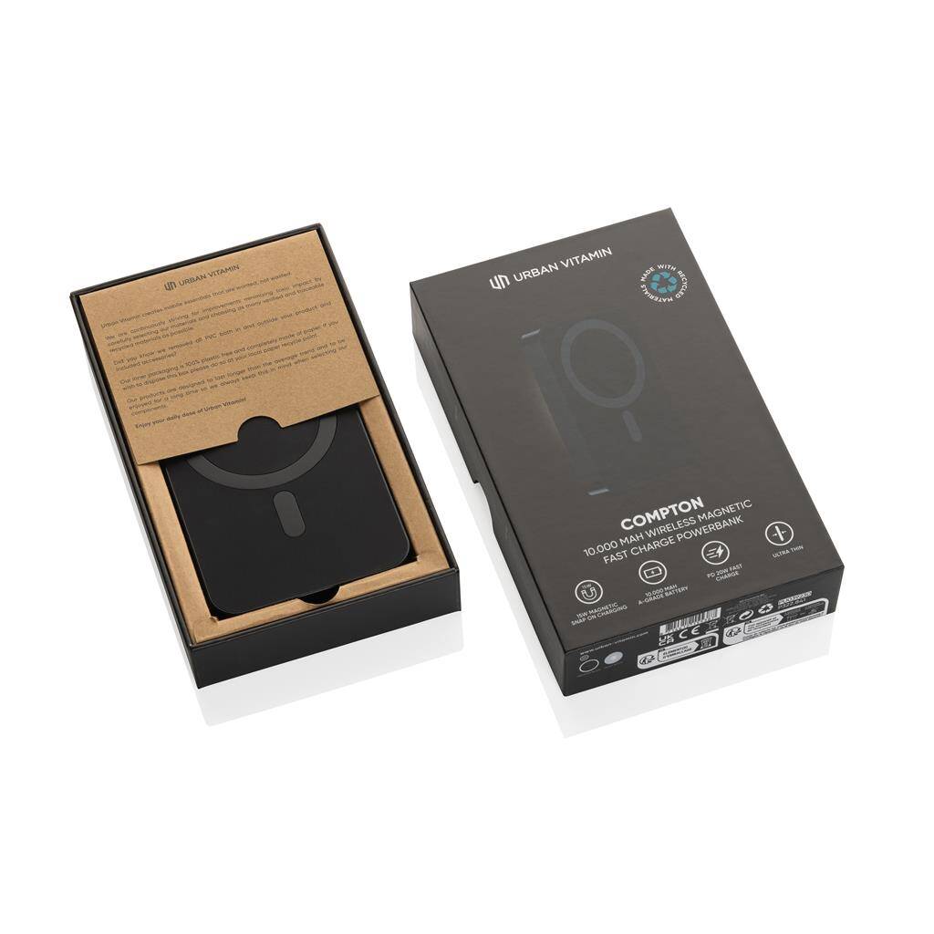 Compton 10000mAh Varavirtalähde Kierrätysmateriaalista. Comptonin magneettinen teknologia kiinnittyy helposti iPhone 12:een ja uudempiin malleihin sekä uuden sukupolven Android-puhelimiin.