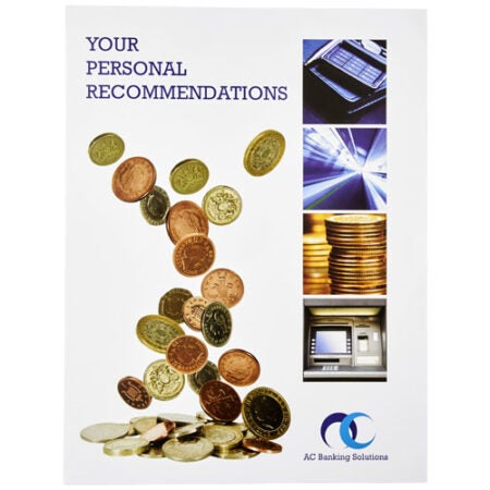 Dokumenttikansio A4 kannessa paikka käyntikortille. Painatus mahdollista tehdä etukanteen, takakanteen sekä etukannen sisäpuolelle.
