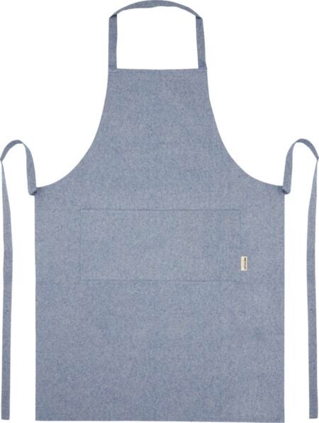Kierrätetystä puuvilla-polyesteriseoksesta valmistettu esiliina ( 200 g/m²). Kaksi vierekkäistä taskua, joiden yhteiskoko on 45 x 20 cm ja metrin pituiset sidontanauhat.