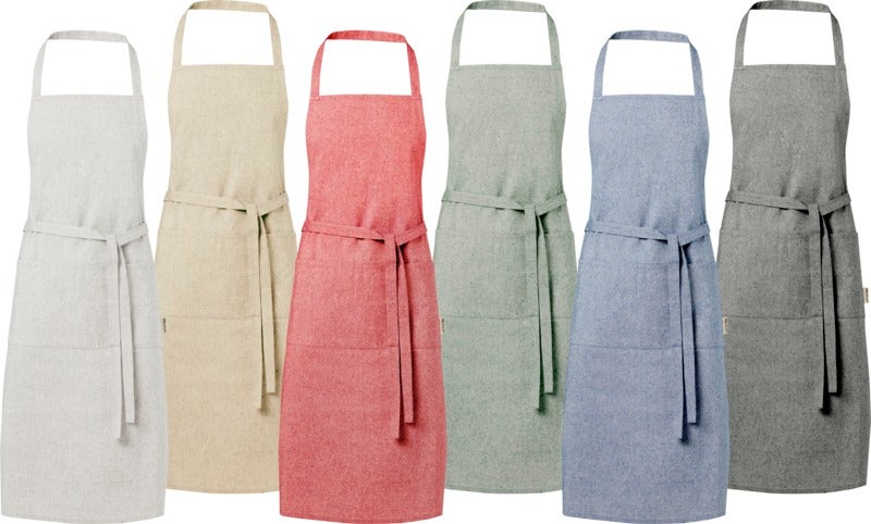 Kierrätetystä puuvilla-polyesteriseoksesta valmistettu esiliina ( 200 g/m²). Kaksi vierekkäistä taskua, joiden yhteiskoko on 45 x 20 cm ja metrin pituiset sidontanauhat.