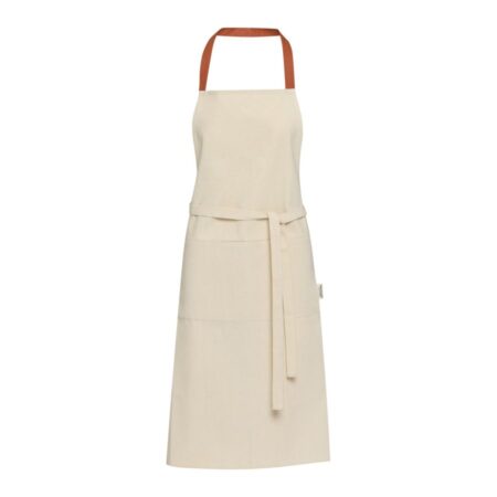 Esiliina on luonnollisen puuvillan värinen, siinä on kontrastivärinen niskalenkki ja se suojaa vaatteita ruoanlaiton aikana.
