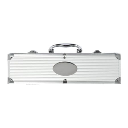 Grillisetti Alumiinisalkussa. Kätevässä alumiinisalkussa laadukas lasta, pihdit sekä haarukka.