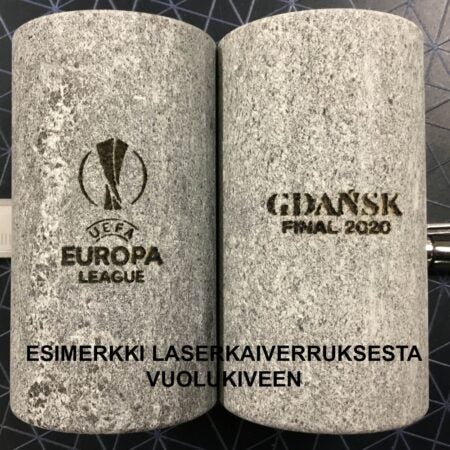 Kuvissa Esimerkki laserkaiverruksesta vuolukiveen. Huomioithan että kaiverrettava logo ei ole aivan tasavärinen.