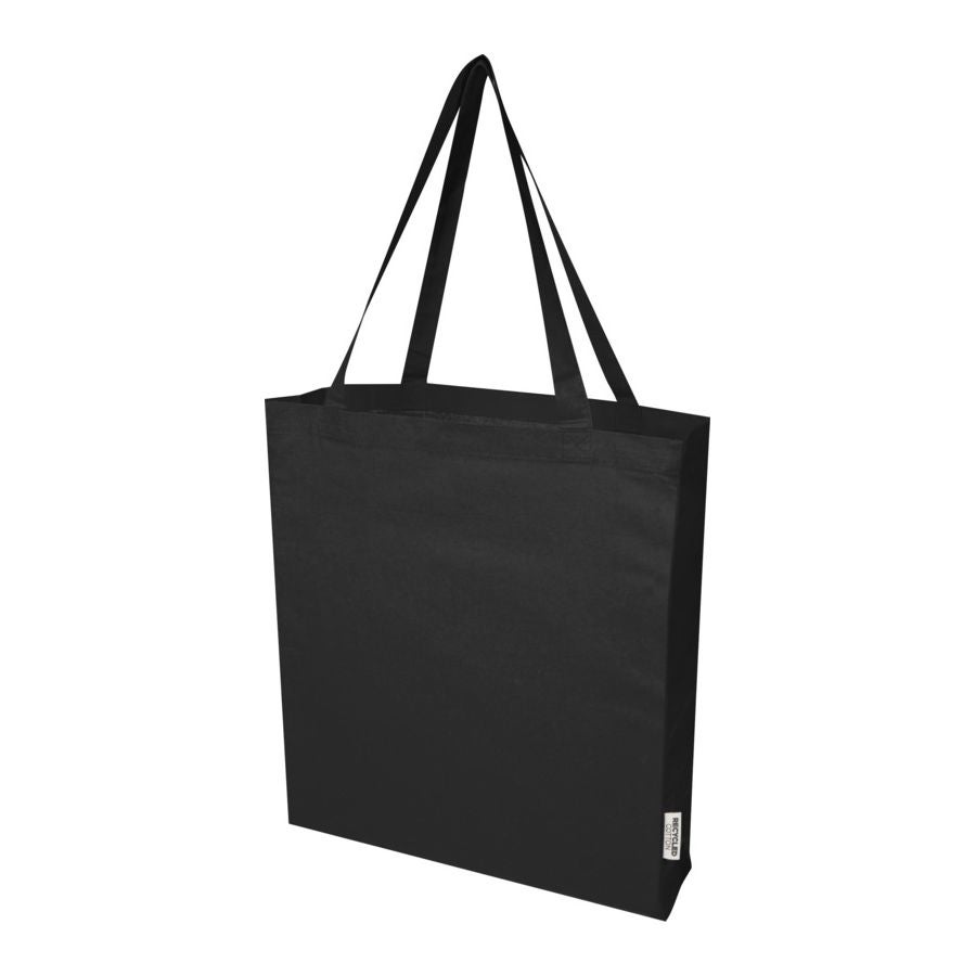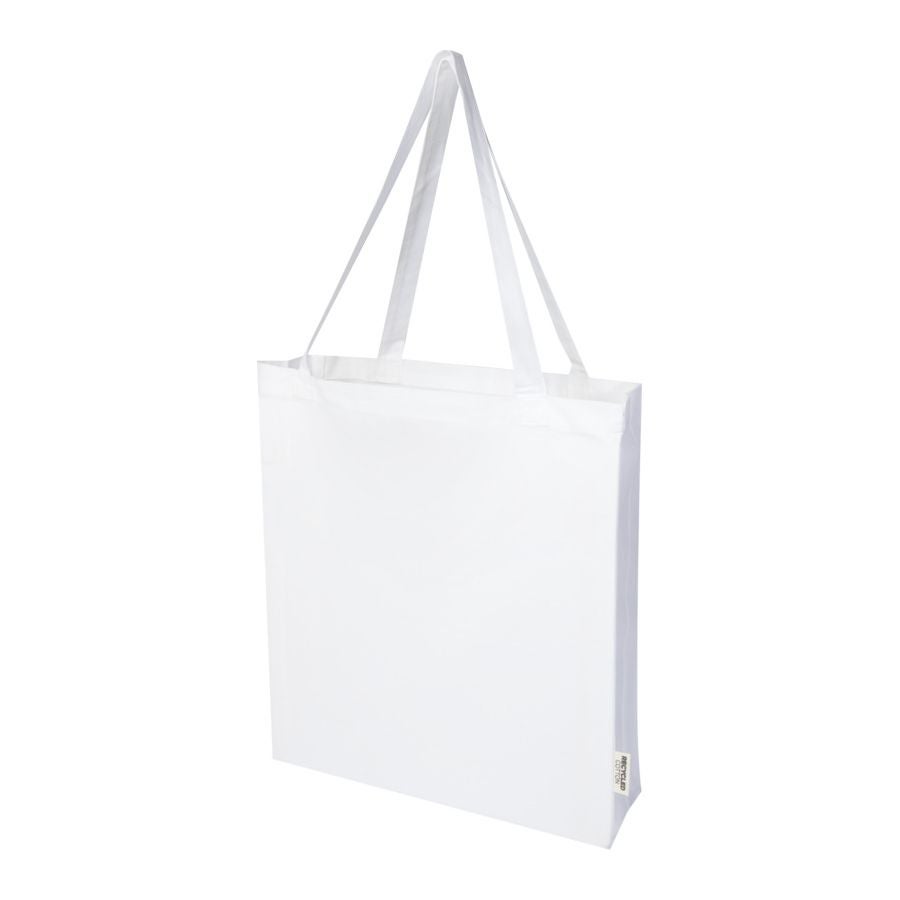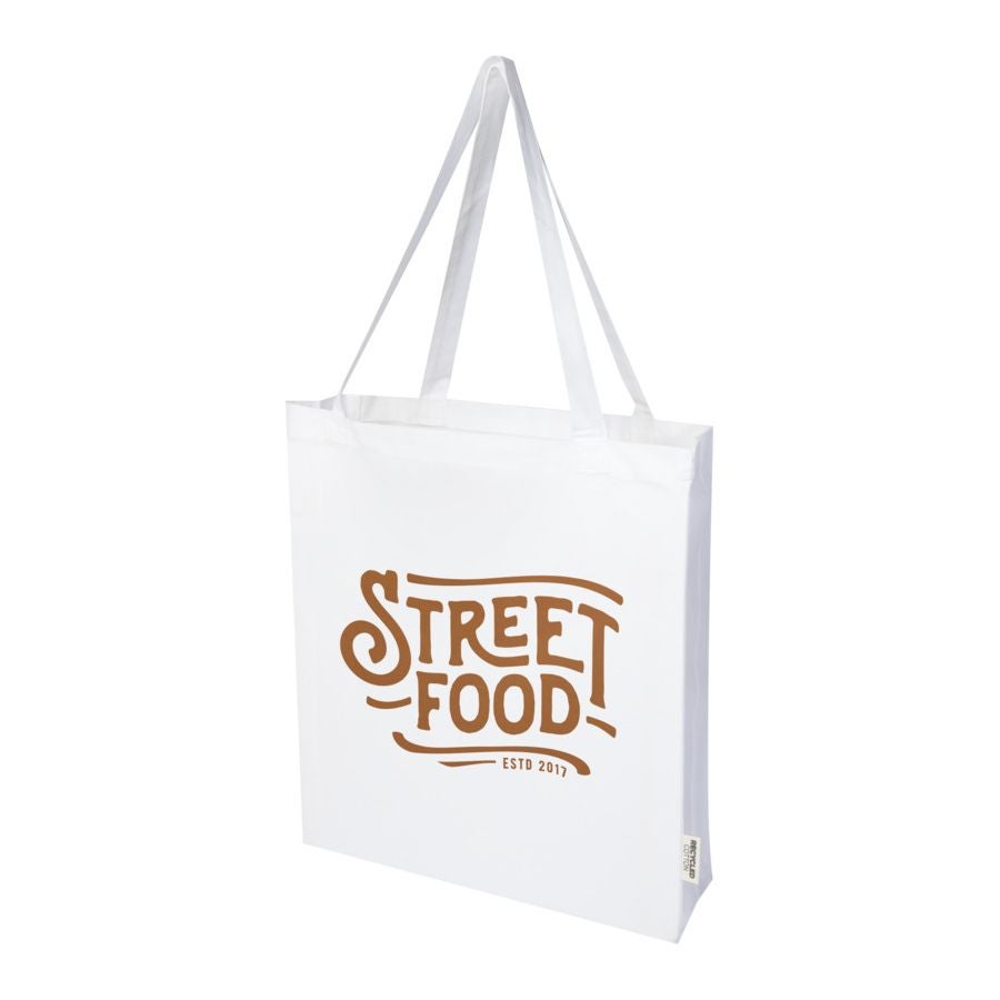 Kauppakassi Kierrätetystä Puuvillasta Pohjalevikkeellä on valmistettu 100-prosenttisesti GRS-sertifioidusta kierrätetystä puuvillasta.