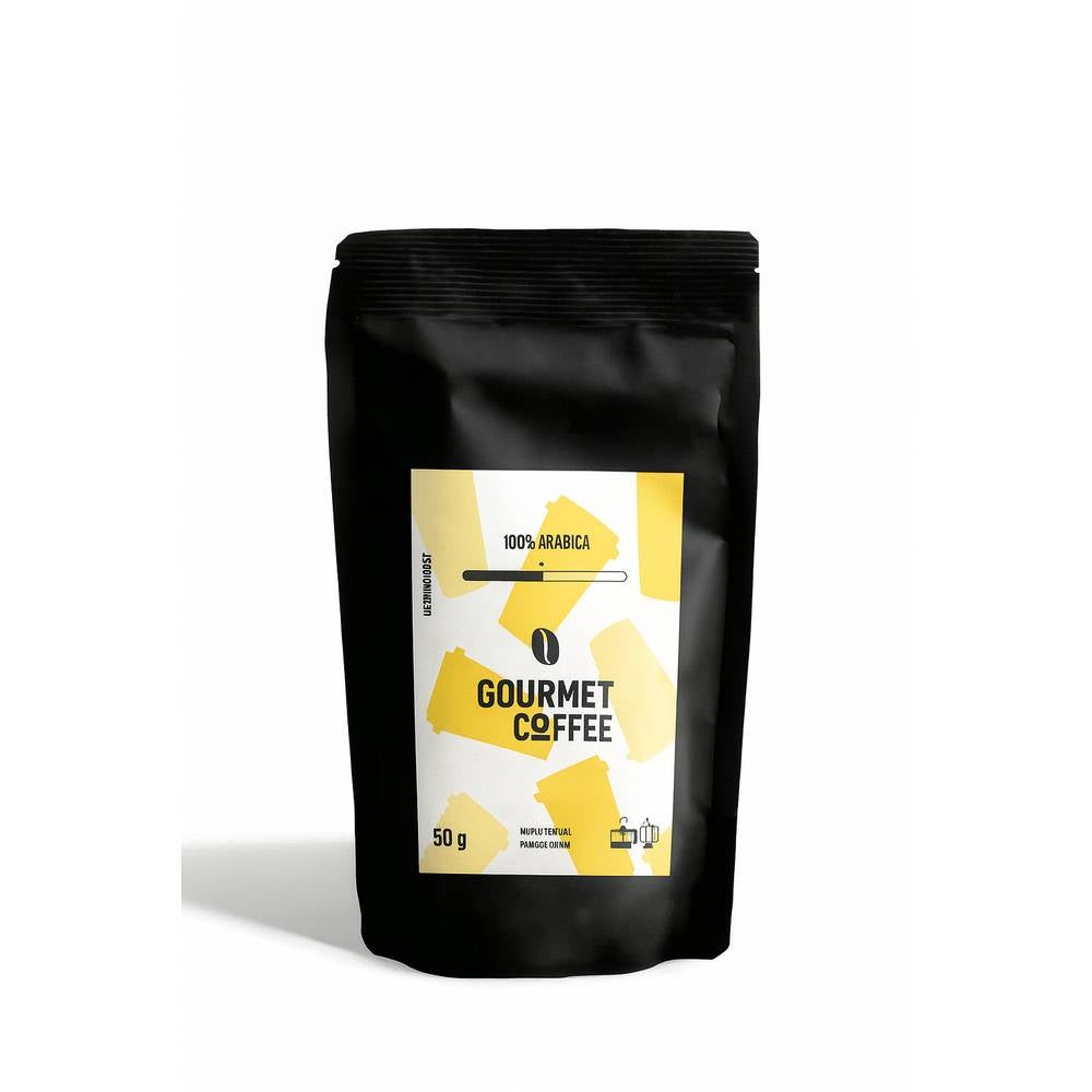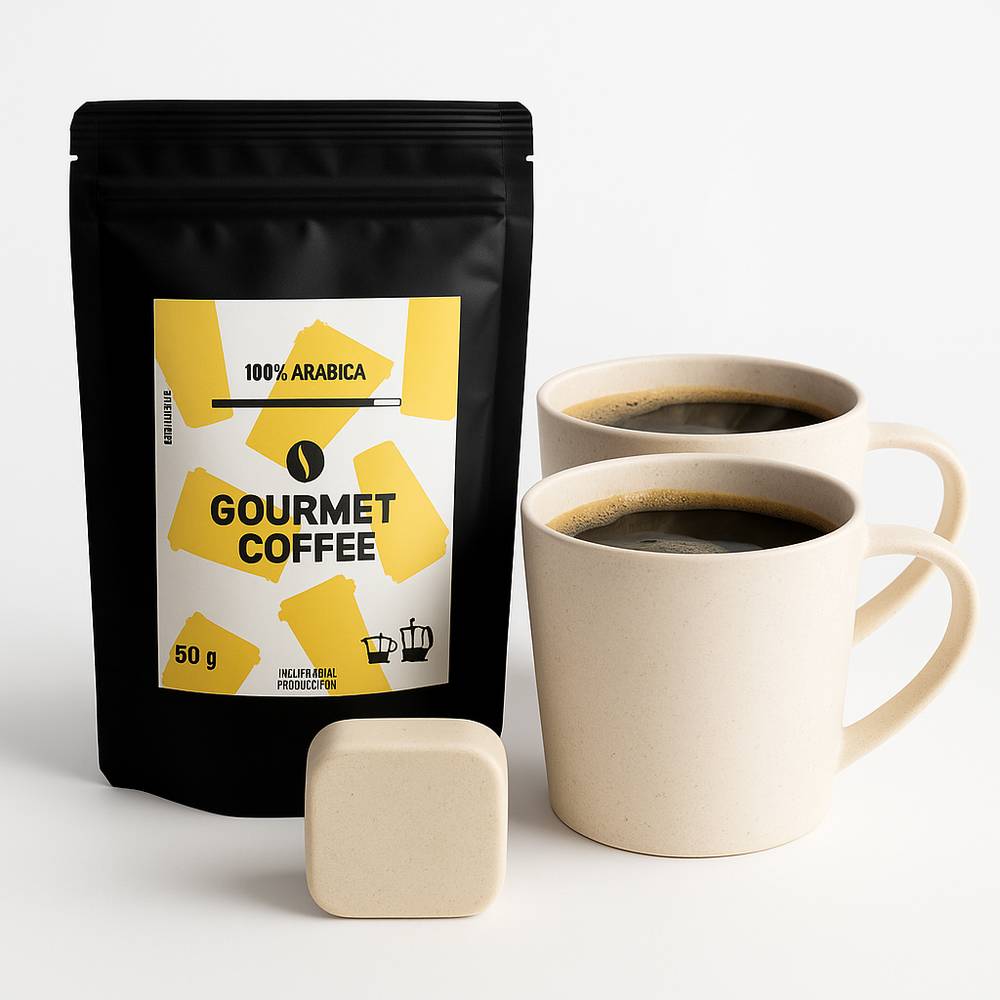 Korkealaatuinen gourmet-kahvi valmistetaan 100 % Arabica-pavuista ja se tarjoaa aidon kahvinautinnon. Setissä oleva 50 gramman pakkaus sisältää noin kahdeksan kupillista kahvia. Kahvipussiin voidaan valita valmis etiketti yrityksen logolla tai suunnitella täysin räätälöity ulkoasu, joka heijastaa brändiäsi. Etiketin koko on 75 x 102 mm ja sen suunnittelu sisältyy hintaan.