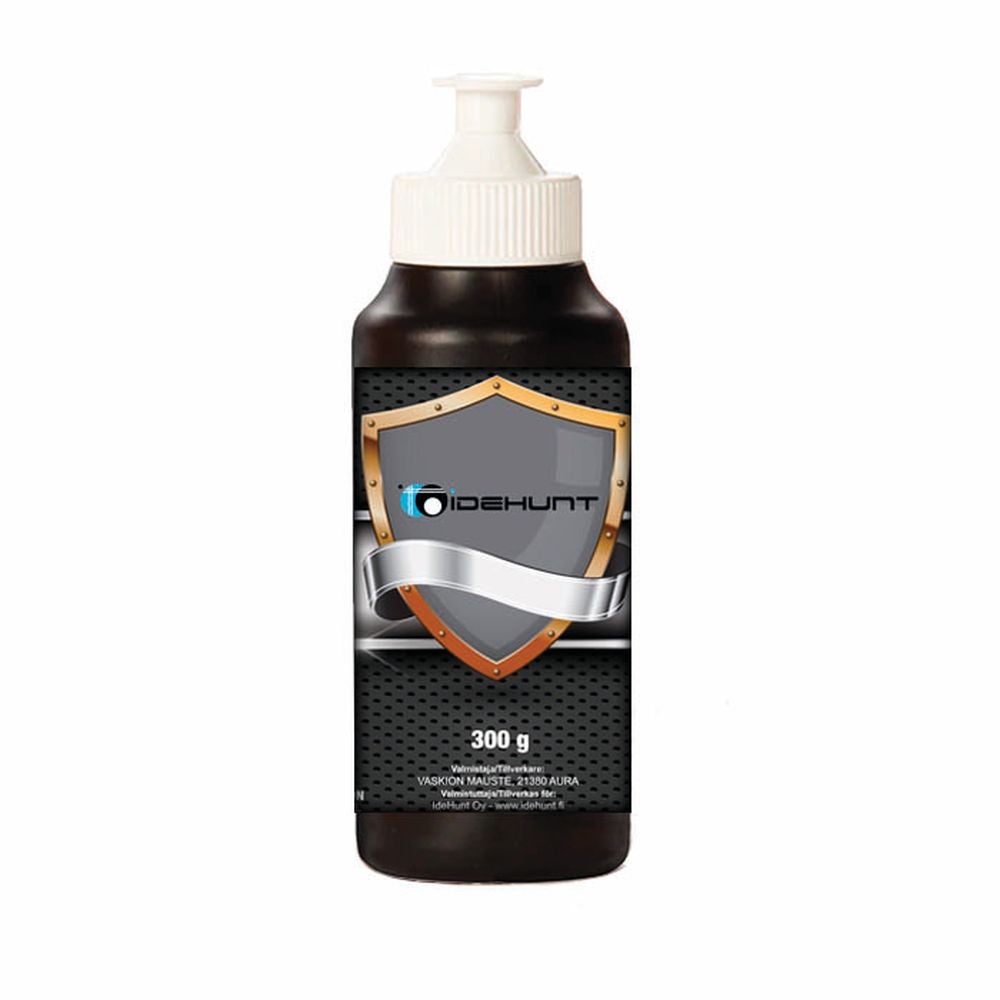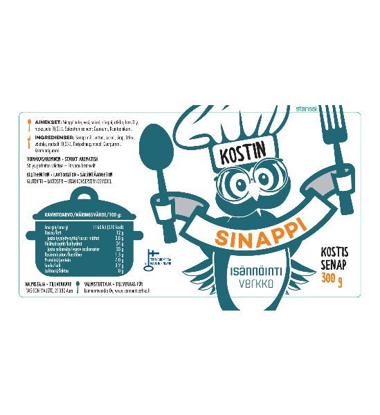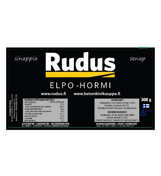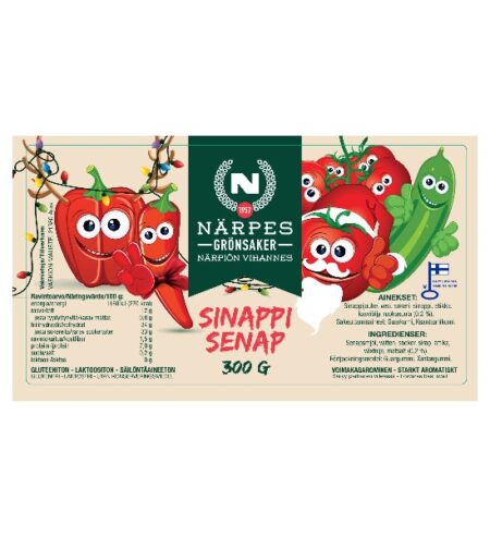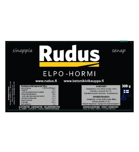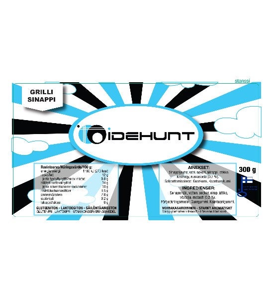Sinappi, etiketit, pullo ja korkki valmistettu SUOMESSA. Sinetöity pullo on musta mustalla korkilla.