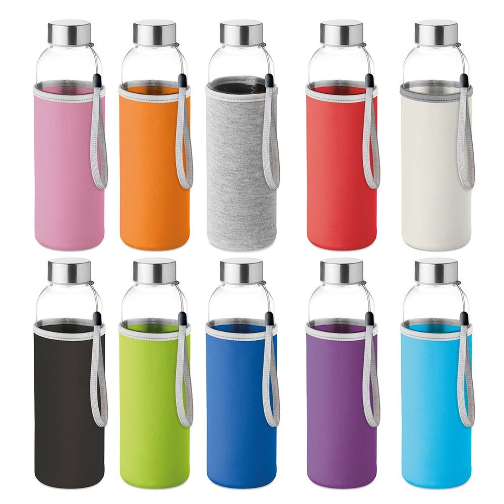 Hygieeninen lasipullo tyylikkäässä neonpreeni pussissa.