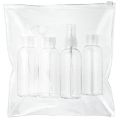 TSA-hyväksytty matkapullosetti. Lentokoneisiin hyväksytty hygieniapussi. Mukana 2 x 50 ml pulloa, 1 x 90 ml pullo ja 1 x suihke ja suppilo.