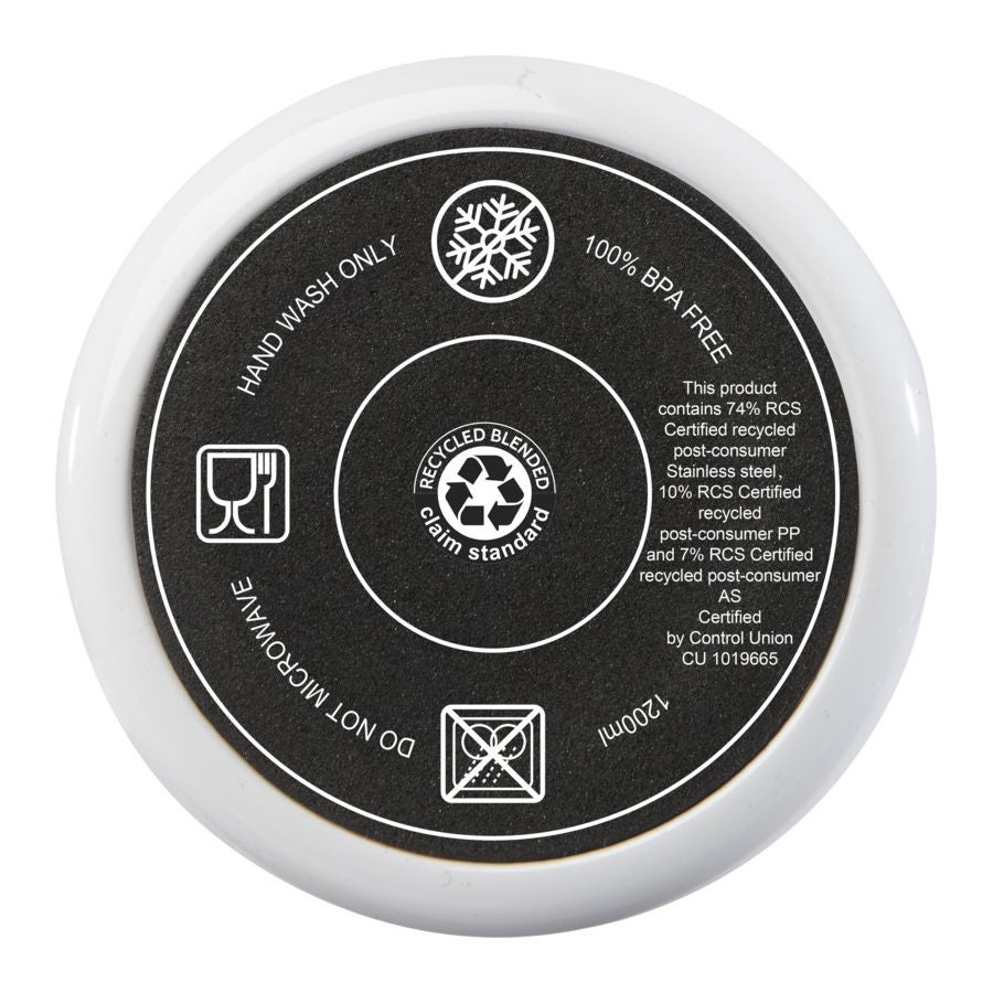 Mukin sisäseinä on kierrätettyä muovia ja ulkoseinä RCS-sertifioitua kierrätettyä ruostumatonta terästä.