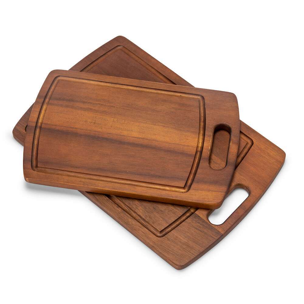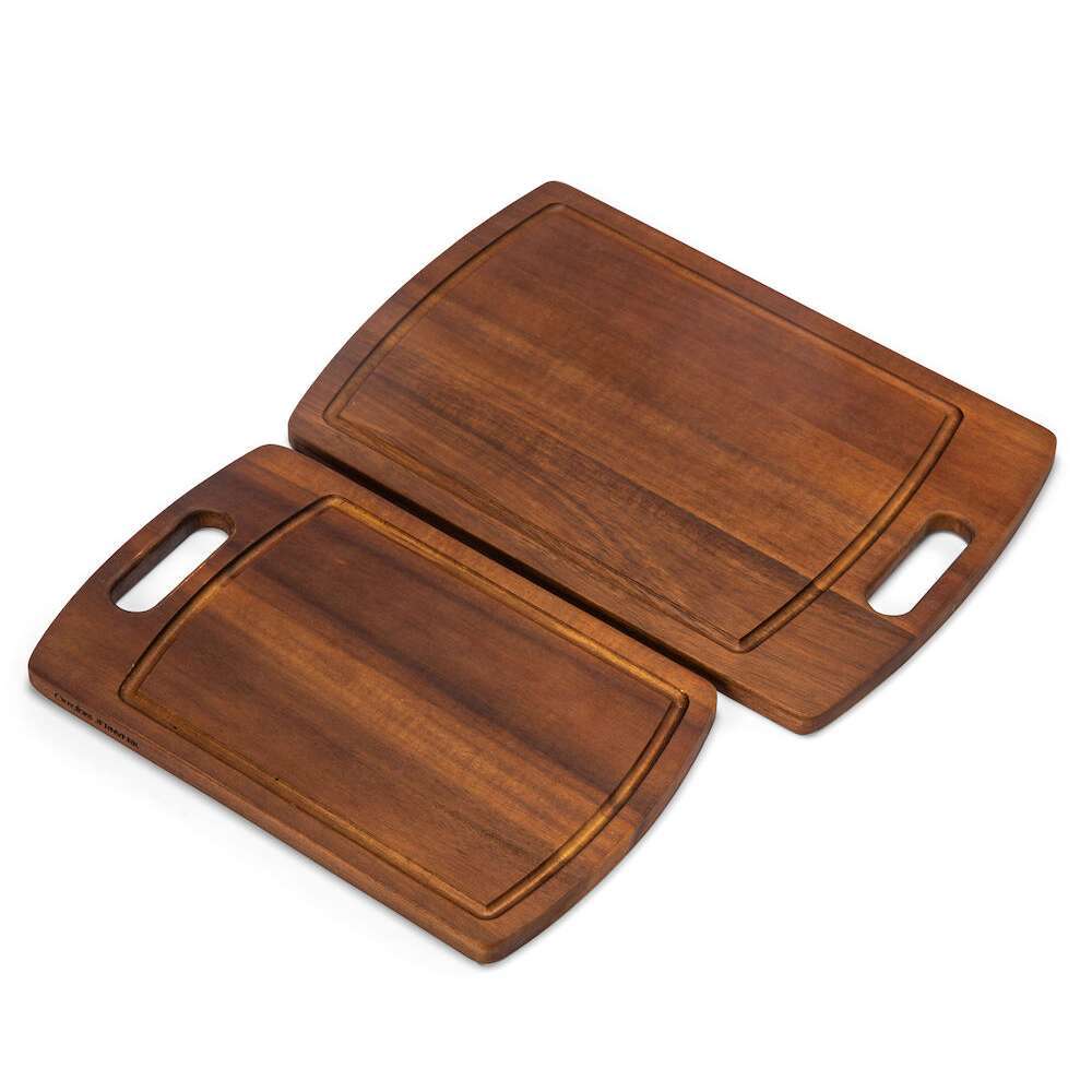 Pakkauksessa kaksi kevyttä Orrefors Jernverk leikkuulautaa, jotka on valmistettu kauniista akaasiapuusta.