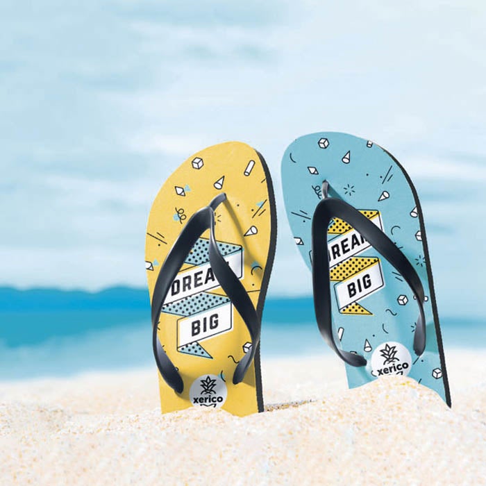 Rantasandaalit Täysväripainatuksella. Laadukkaat rantasandaalit joihin painatus tehdään sublimaatiopainatuksella.