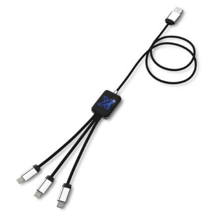 Pitkä 3-in-1 latausjohto tyylikkäällä valaistuvalla logolla. Kumi ja metallipintainen kaapeli jossa on kolme eri liitintä (Type-C, Android, iPhone).