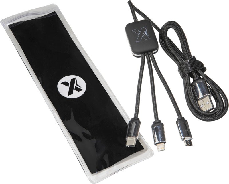 Pitkä 3-in-1 latausjohto tyylikkäällä valaistuvalla logolla. Kumi ja metallipintainen kaapeli jossa on kolme eri liitintä (Type-C, Android, iPhone).