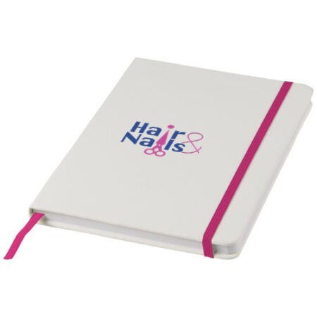 Spectrum Muistikirja A5 Duo Color valkoisella kannella ja värillisellä joustavalla suljentanauhalla sekä sivumerkillä.