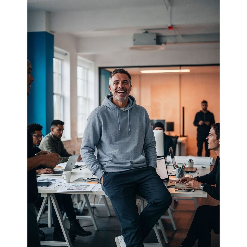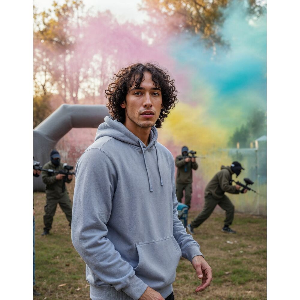 Hupparissa on säädettävä kiristysnyörillinen huppu, 2×1-resorit hihansuissa ja helmassa. Huppari on entsyymipesty, joten se tuntuu pehmeältä. Paino: 350 g/m²