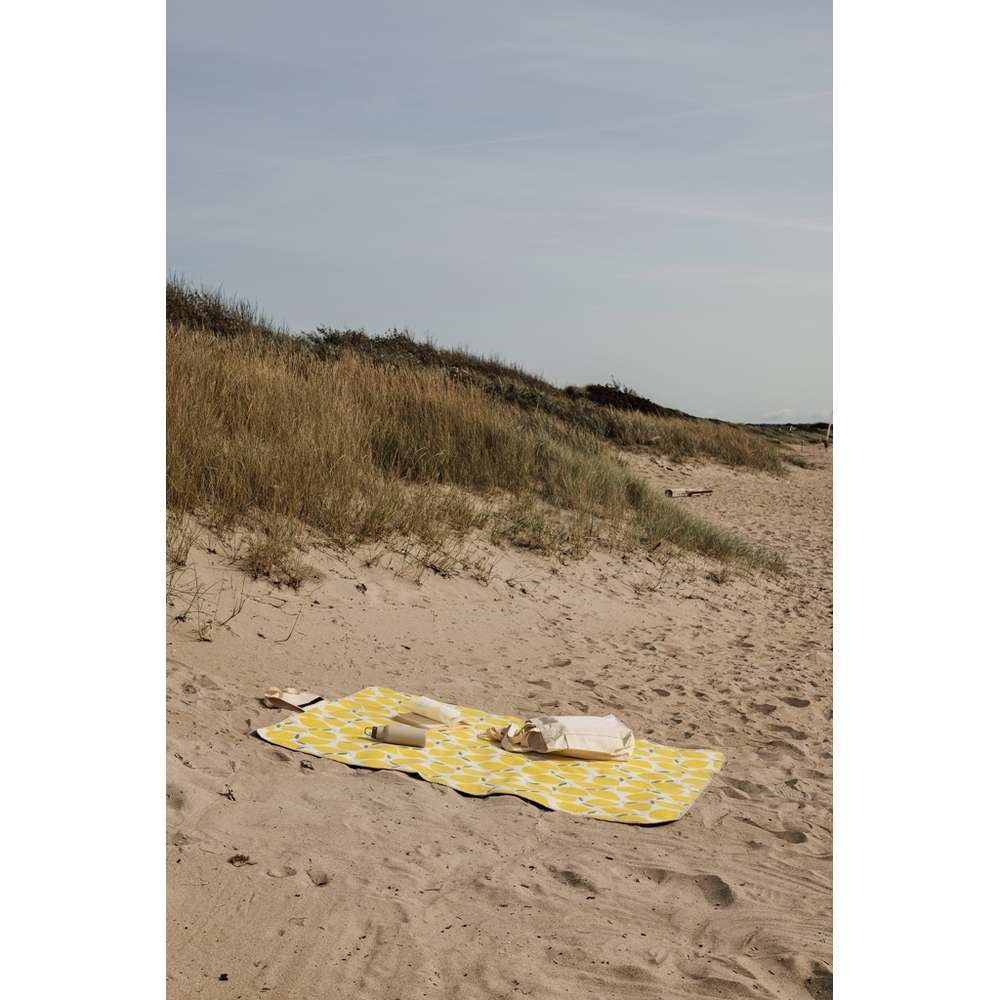 Huovan pinta on iloisesti sitruunakuvioitua fleeceä ja pohja vettä hylkivää PEVA:a. Siinä on puuvillakanvaksesta tehty läppä ja pitkä kantokahva.