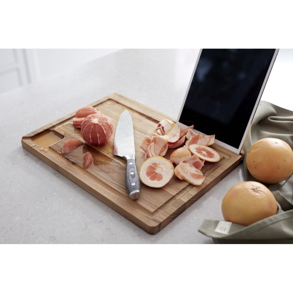 Lisäksi laudassa on käytännöllinen ura, jota pitkin nesteet voi helposti kaataa pois ilman että ne valuvat pöydälle.