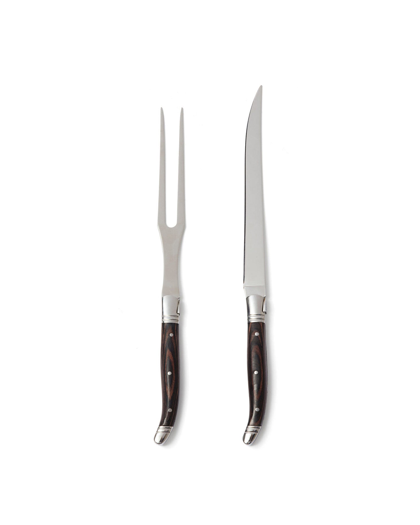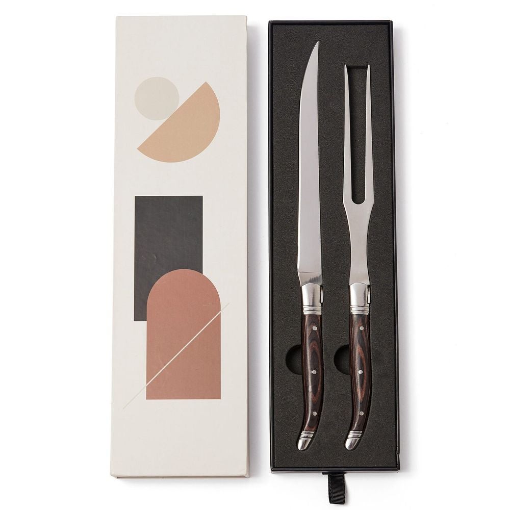 Terävä ja konepestävä paistiveitsi ja –haarukkasetti, jossa terät ovat ruostumatonta terästä ja kahvat Pakkawoodia.