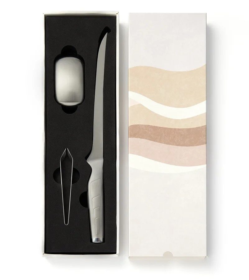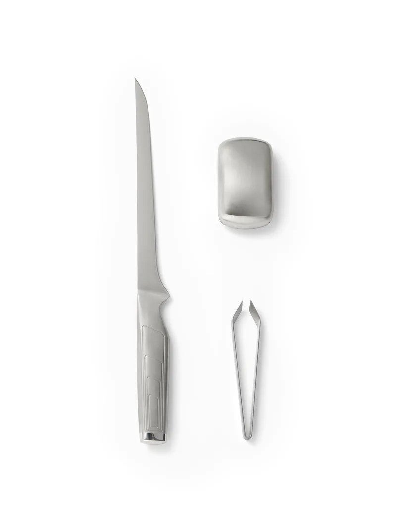 Settiin sisältyy metallisaippua, joka poistaa esimerkiksi kalan ja valkosipulin hajut. Pakkaus sisältää myös pinsetit pienten ruotojen poistamiseen kalasta.