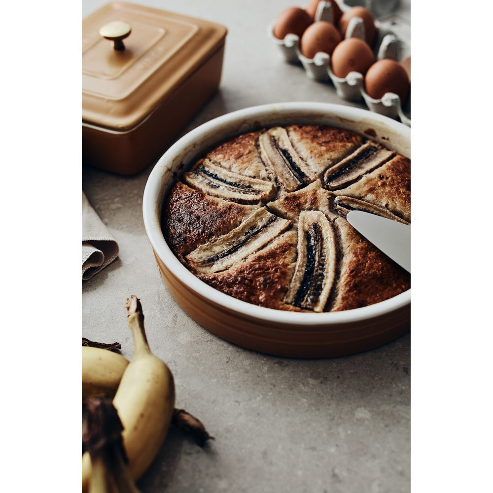 Matta ulkopinta ja valkoinen pinnoitettu sisäpinta. Kätevän pinnoitteen ansiosta vuoka on helppo pestä.
