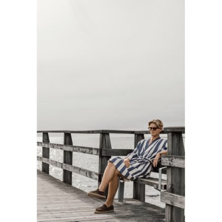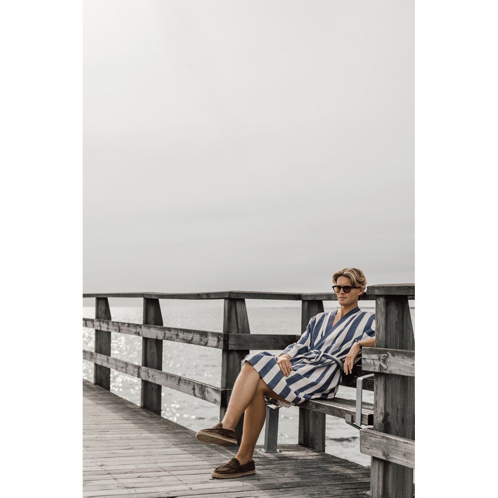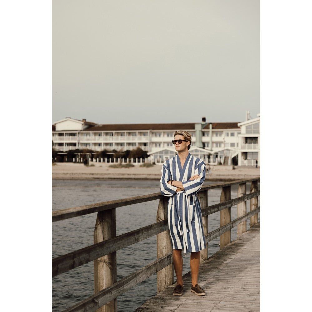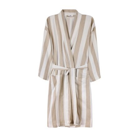 Tyyliltään klassisessa kylpytakissa on kaksivärinen raitakuviointi, siisti kaulus, etutaskut, 3/4-pituiset hihat ja vyö vyötäisillä täydellisen istuvuuden varmistamiseksi.