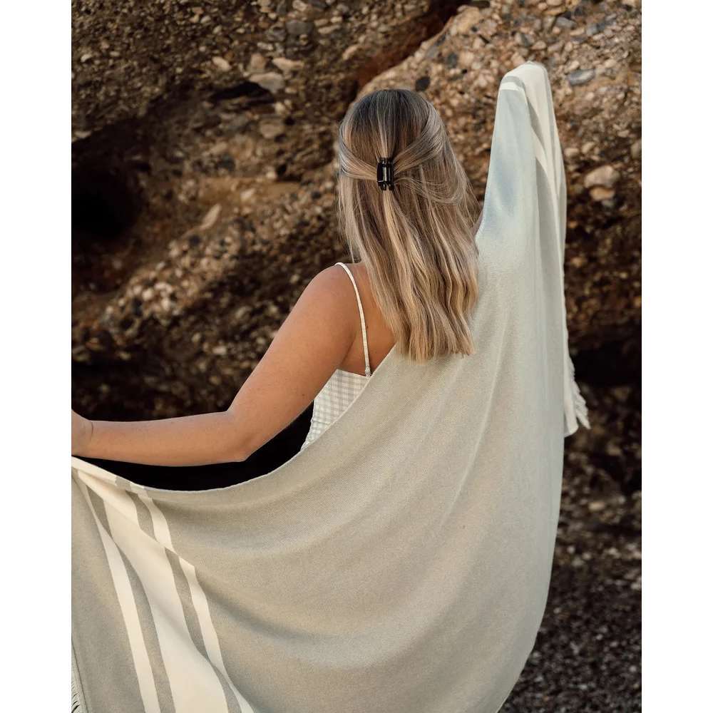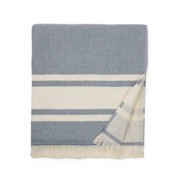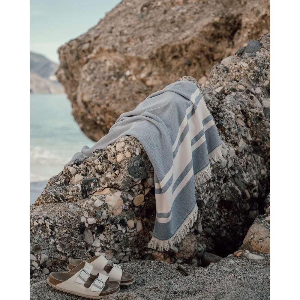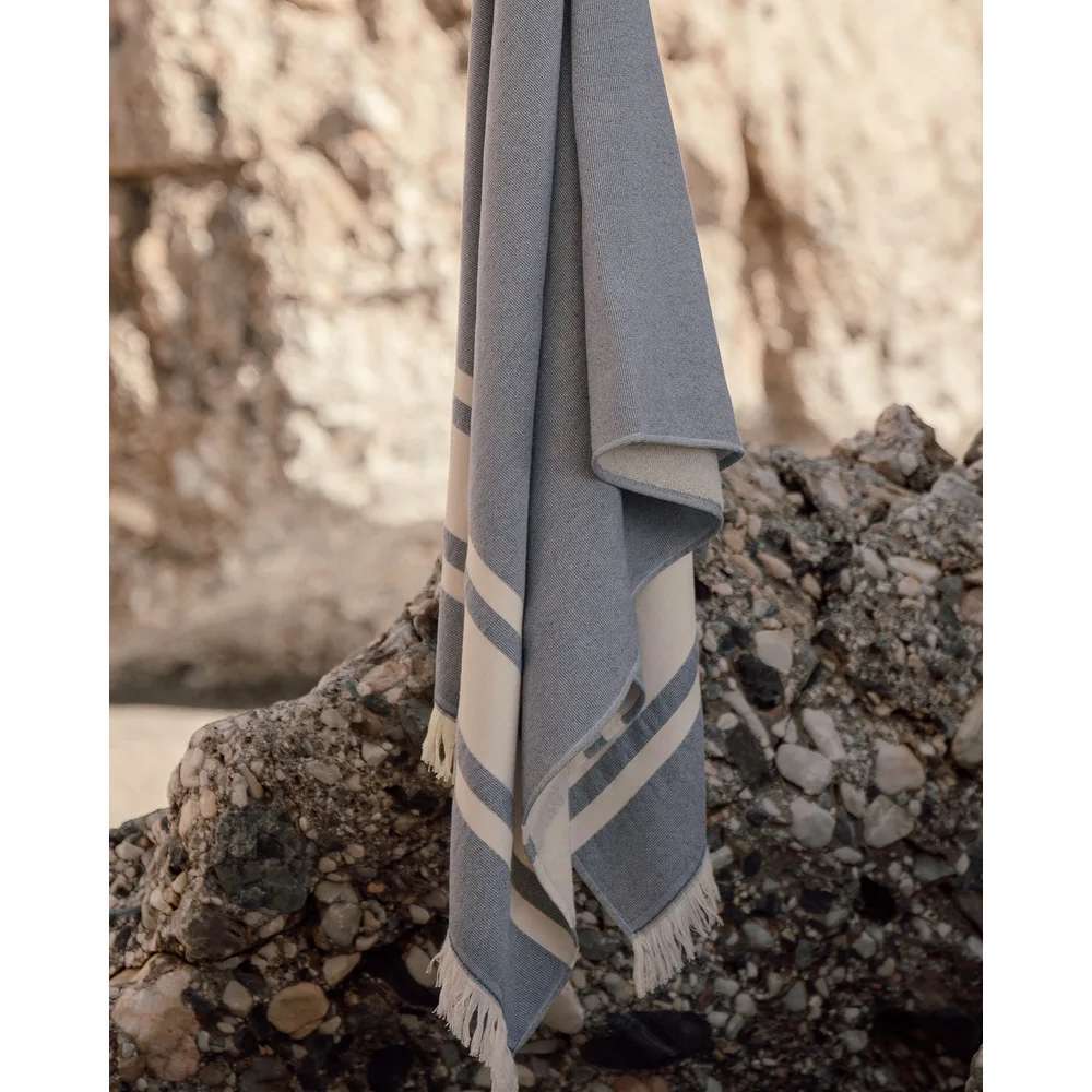 Vinga Tolo Hamam Froteepyyhe, jossa on kaksi erilaista tekstuuria: toinen puoli froteeta ja toinen puoli sileää kudosta.