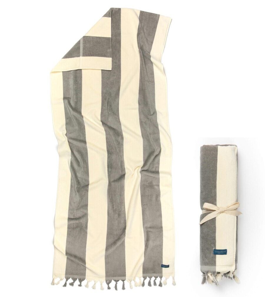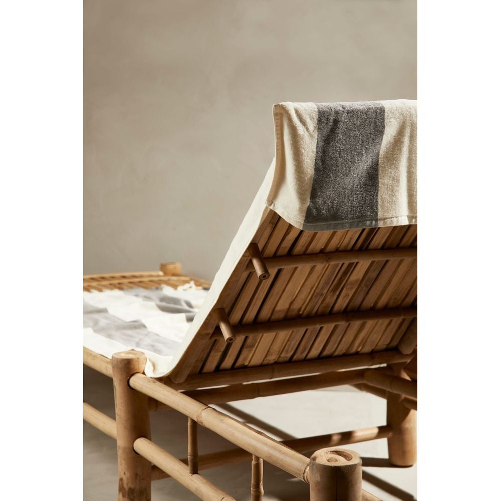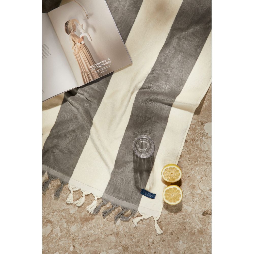 Vinga Valmer Aurinkotuolipyyhe on ylellinen puuvillainen pyyhe, jonka toisella lyhyellä sivulla on koristetupsut ja toisella tasku aurinkotuolia varten.